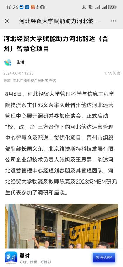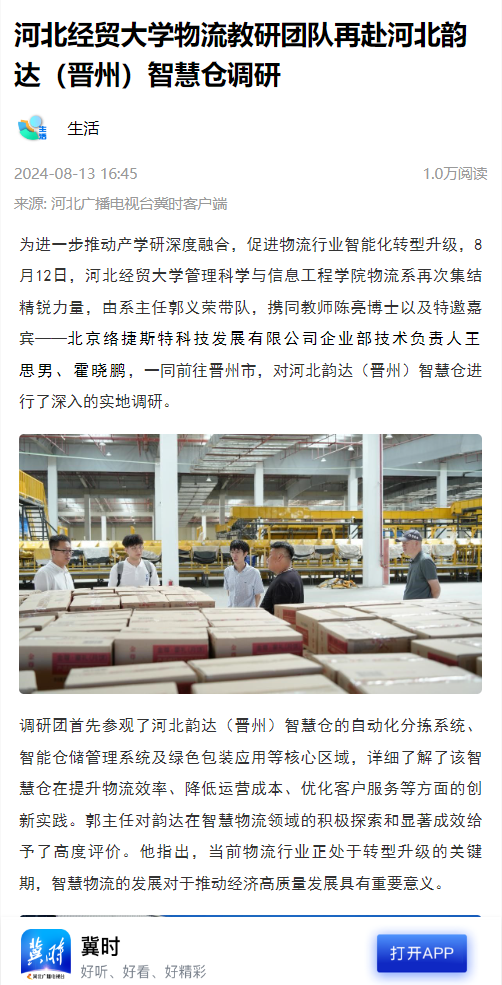 4.河北广播电视台冀时客户端:yl6809永利物流教研团队再赴河北韵达(晋州)智慧仓调研。https://web.cmc.hebtv.com/cms/rmt0336_html/0/0rmhlm/mt/sh/fbt/11585416.shtml?share=true