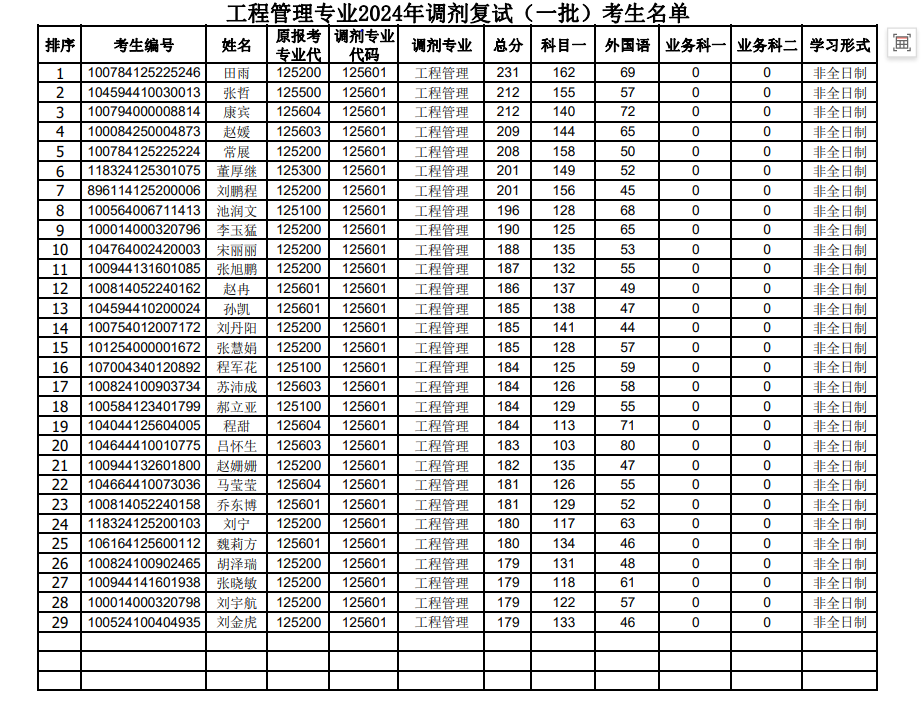管理科学与工程专业2024年调剂复试(一批)考生名单