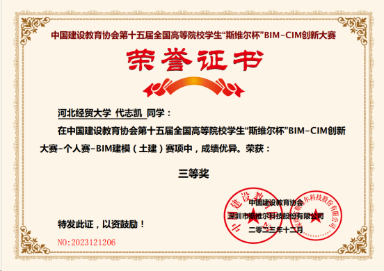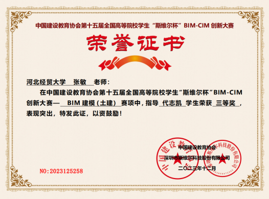 近日,第十五届全国高等院校员工“斯维尔杯”BIM-CIM创新大赛BIM建模个人赛获奖名单公示,工程管理系张敏老师指导员工参加了BIM建模项目比赛,获全国三等奖1项。
