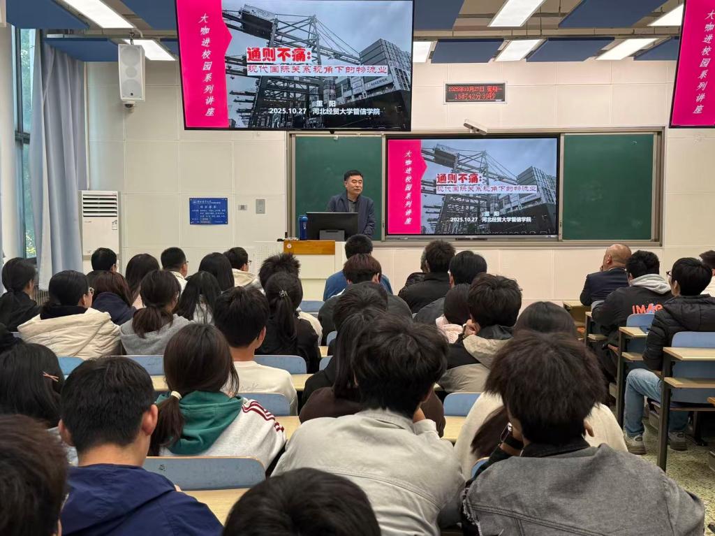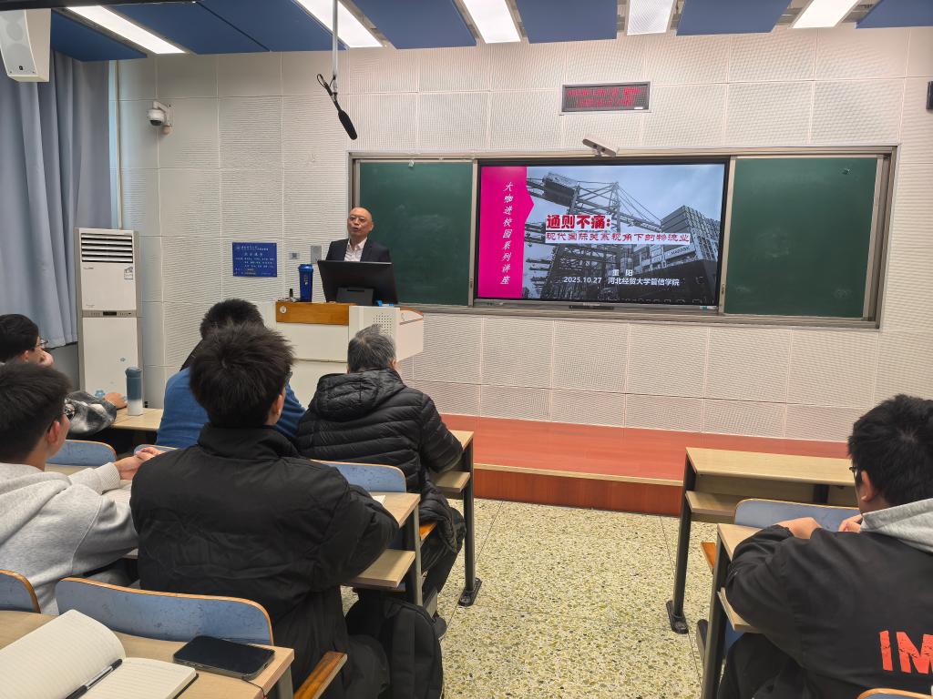 10月27日下午,中国第三届金声奖及第一届燕赵文化英才获得者,河北广播电视台首席评论员、正高级编审重阳老师来到yl6809永利北三教B203多媒体教室,为yl6809永利教师、MEM研究生和物流系本科学子共计一百余人带来了题为《通则不痛:现代国际关系视角下的物流业》的主题讲座。